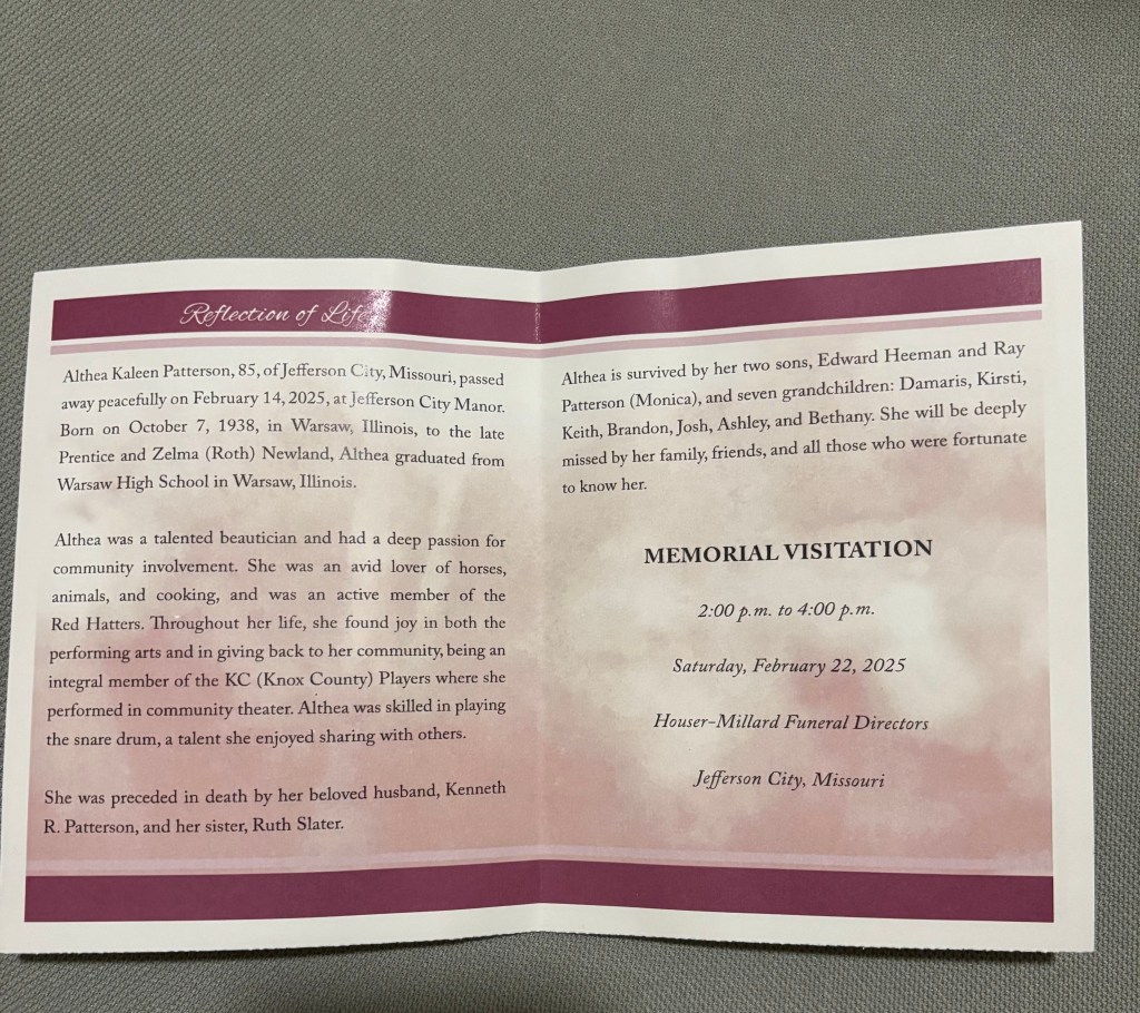我的婆婆Althea Patterson 于2025年2月14日,周五,情人节这天下午4时45分,在她居住的Jefferson City Manor Care Center安详离世了,享年85周岁(10/7/1939-2/14/2025)。