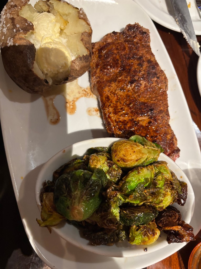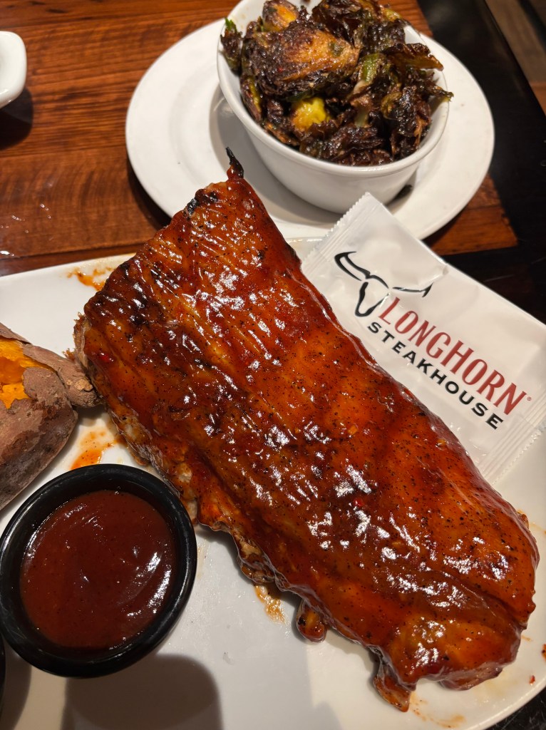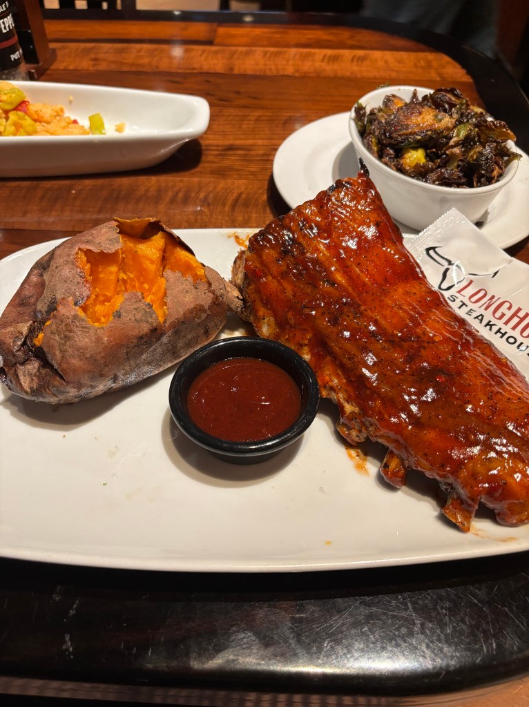 悼念活动结束之后,我们四人一起去德州餐厅吃了晚饭。他们三人狼吞虎咽,我却因为困意十足+之前吃得太多而留下主食,队友打包留作明日午饭了。Brandon竟然主动说要分开付。
