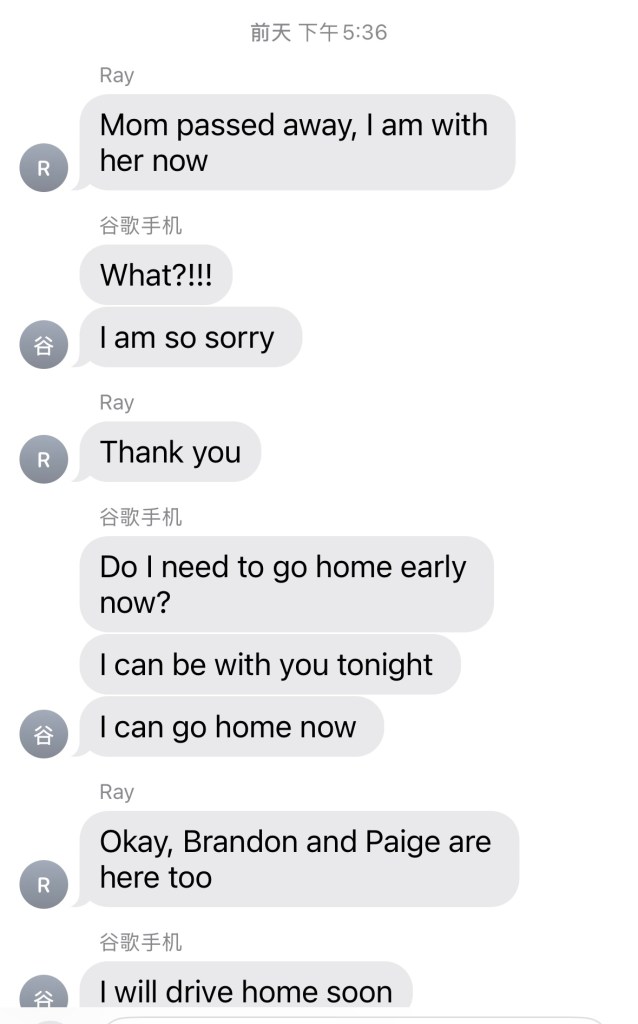 接着,去Sam’s 和Hy-vee例行买了些下周吃食。回家路上,我们聊起婆婆的离开也是有值得欣慰的地方的,队友表示认可。他说他和她都终于relieved了,之前都随着绷着一根弦,随时等待着这一天的到来,现在彻底放下了悬在心头的石头;而且,婆婆并没有经历临终前在医院数周被各种治疗的痛苦,她只是头天开始就不怎么吃饭了,然后第二天就自然终老了。这已经胜过大多数人了。对我们而言,遗憾肯定有(比如Nursing home的人在婆婆反常的不再吃饭时就应该告知我们),但不多;对婆婆而言,应该是没有太多的,她老早就已经在等待这一天了。