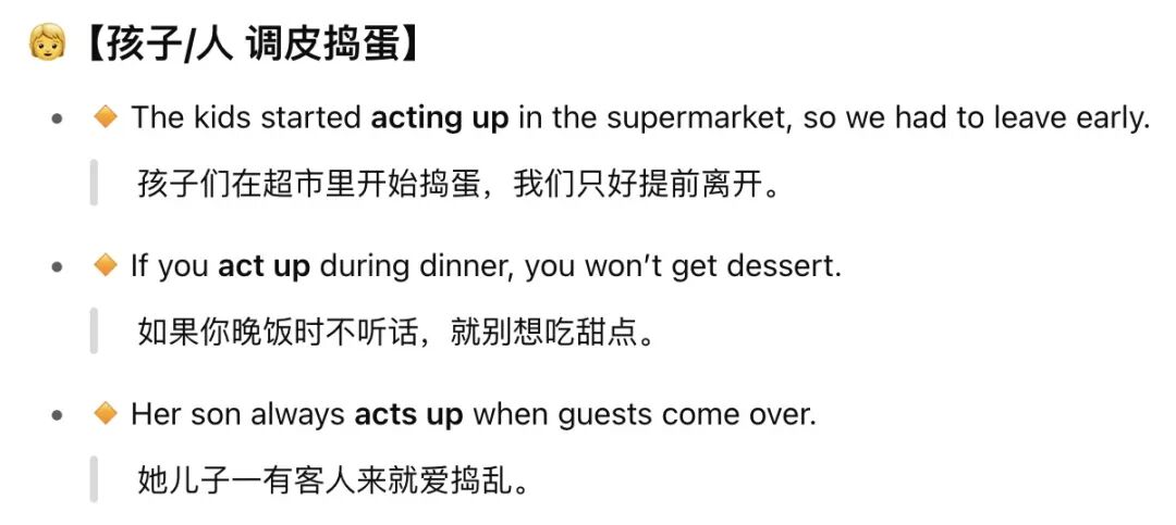 可惜Mrs.Huber的好奇心没有给她带来好运。可见什么人以及有什么样的好奇心是很重要的,决定了最终会带来什么。❖ Behave / Act up ❖“You are going to behave today…””If any of you acts up…”这是绝望主妇之一Lynette试图对她家无比调皮的三个幼儿进行威吓。我觉得behave这一个词就可以表示“得体,礼貌,规矩”,很是简洁有力。当然完整版也可以说“Behave yourself!” 它在美国家长语境中非常常见,含有严肃的警告意味。act up也是口语中一个很生动的短语,意为捣蛋、发脾气、调皮等,但它的用途更为广泛。