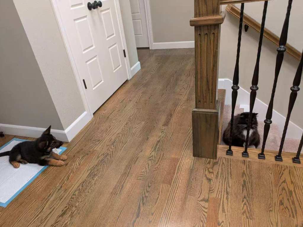 第四晚,周二,我把沙发、某人买的简易门和玻璃墙围起来,让狗狗睡了一晚,效果还行,但是他太聪明,很快就把那道门打开。